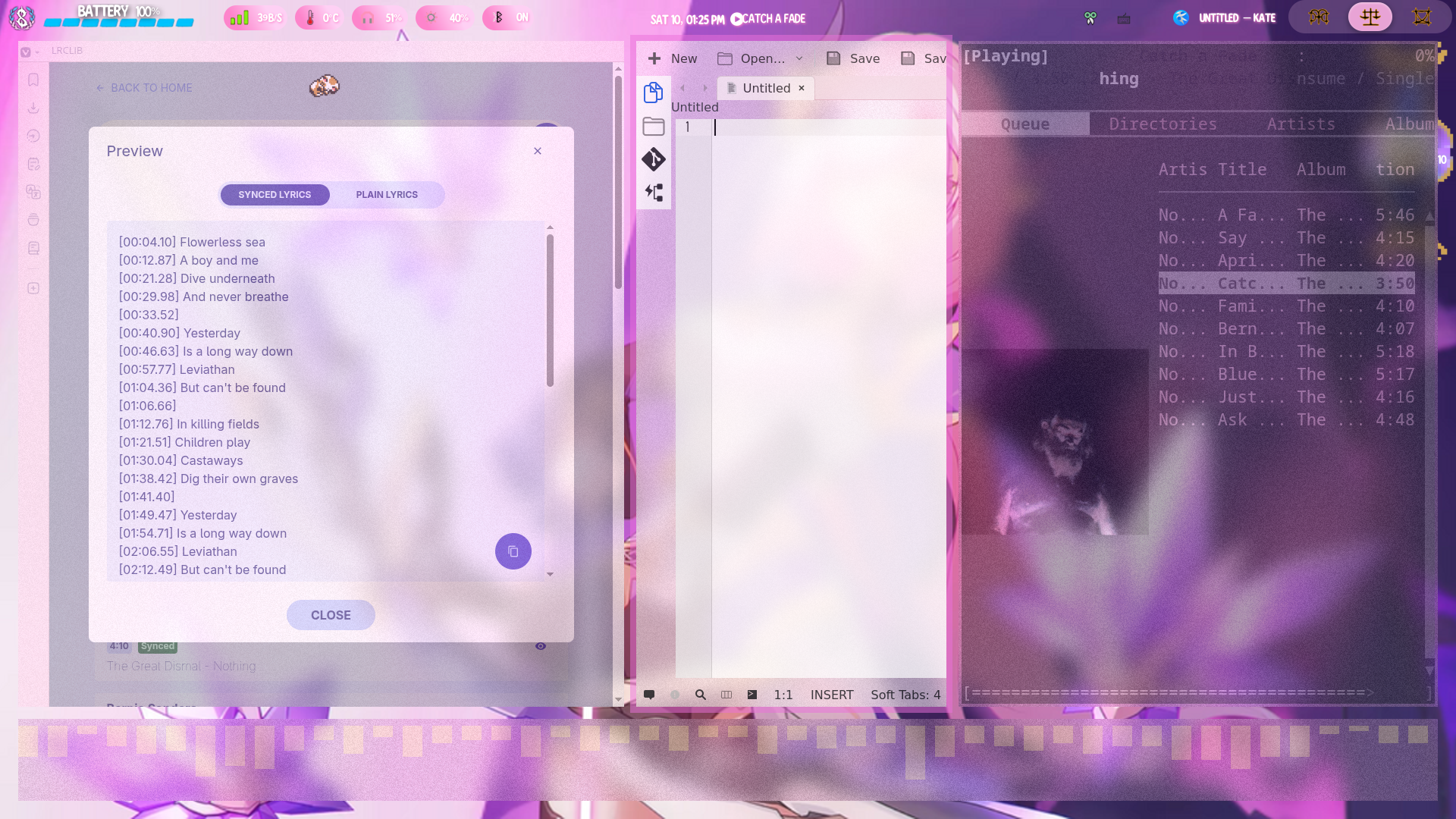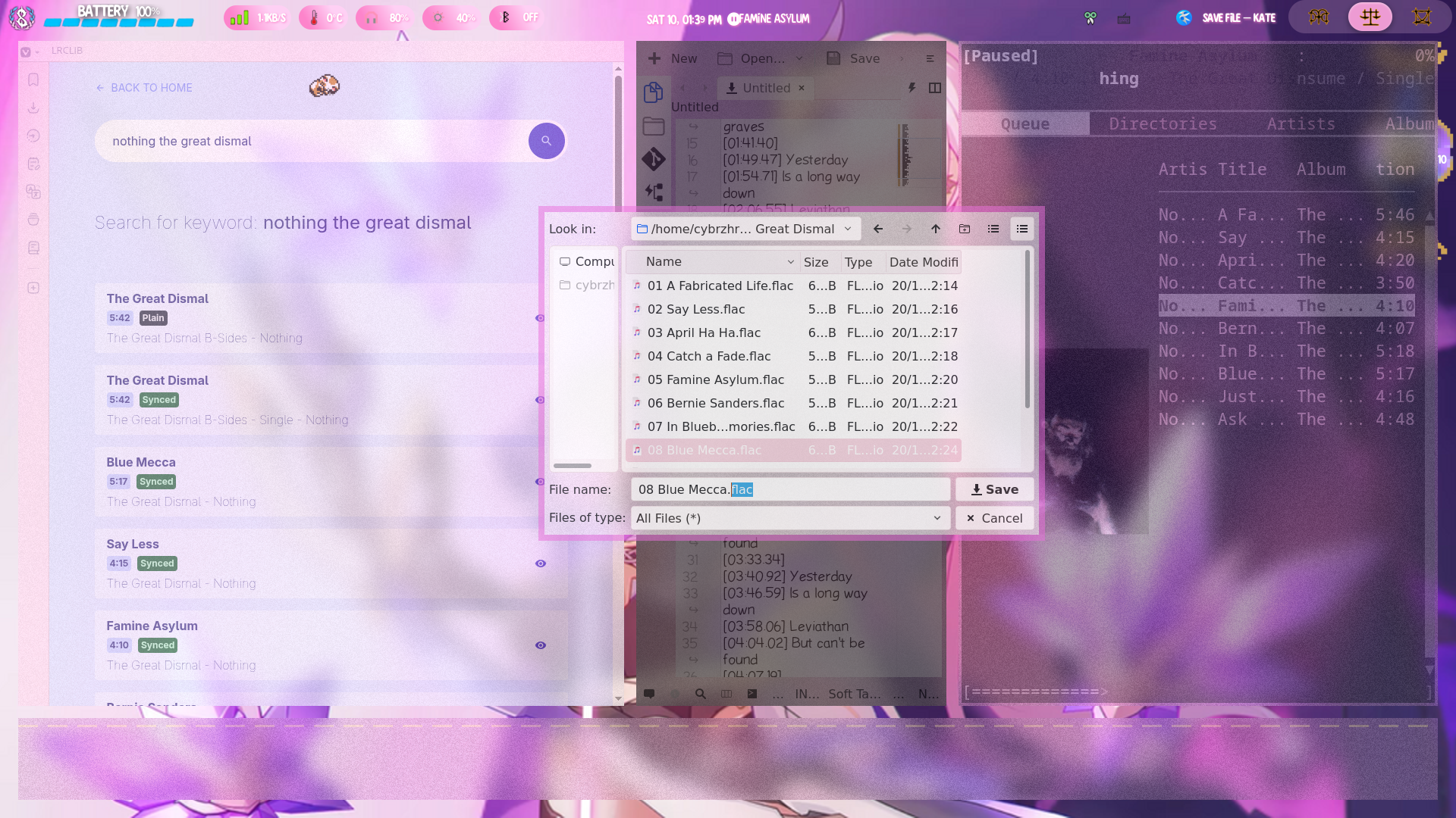 Some music players can scrape lyrics from online, but for an mp3 player that might not always have internet connection you will have to use a '.lrc' file to add timed offline lyrics. For this you will need a computer witha basic text editor such as MS Notepad (I'll be using KDE Kate which is available on GNU Linux, MS Windows, & Apple Mac) & a Browser (the website I reccomend is supper buggy on my Mozzilla based browser so I'd reccomend a Chromium based or forked browser [in general don't use MS Edge, Google Chrome, or Mozzilla Firefox either unless you have a beefy browser that can tank the hit to your ram from the spyware in those browsers] I will be using Vivaldi Tecnologies Vivaldi which is available on GNU Linux, MS Windows, Apple Mac, Apple iOS, & Google Android). I will be adding lyrics to Nothing's The Great Dismal.
