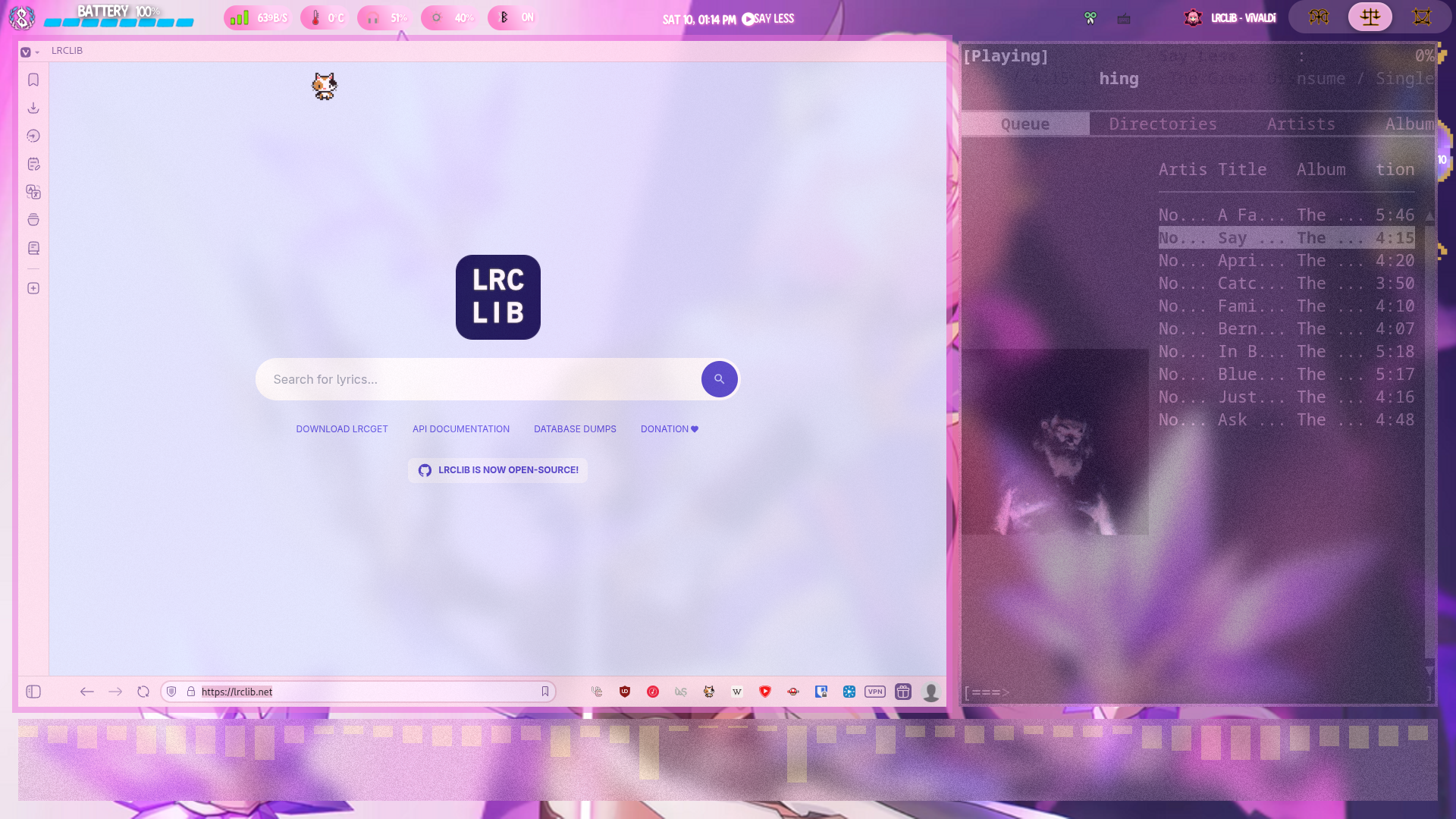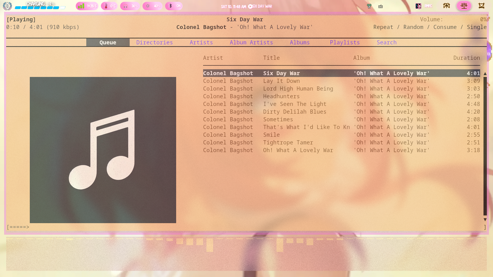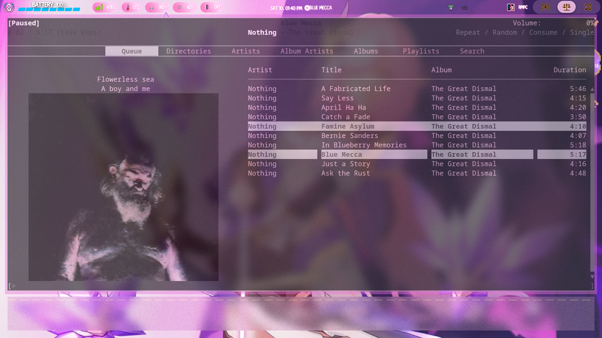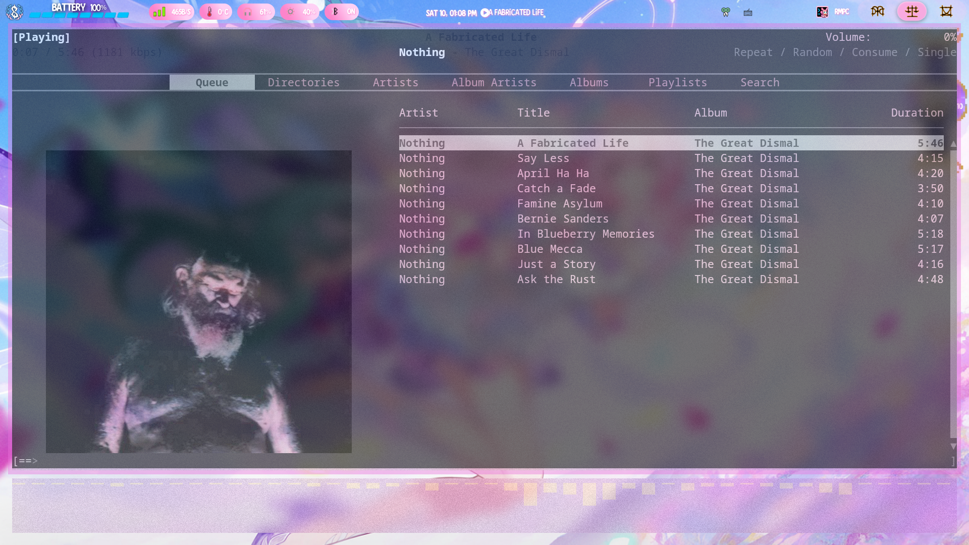 • save the image in the folder with your music files. I'd reccomend titling it cover.{filetype} as some music players look for this instead of the metadata. Unfortunately rmpc, my music player in the pictures, doesn't