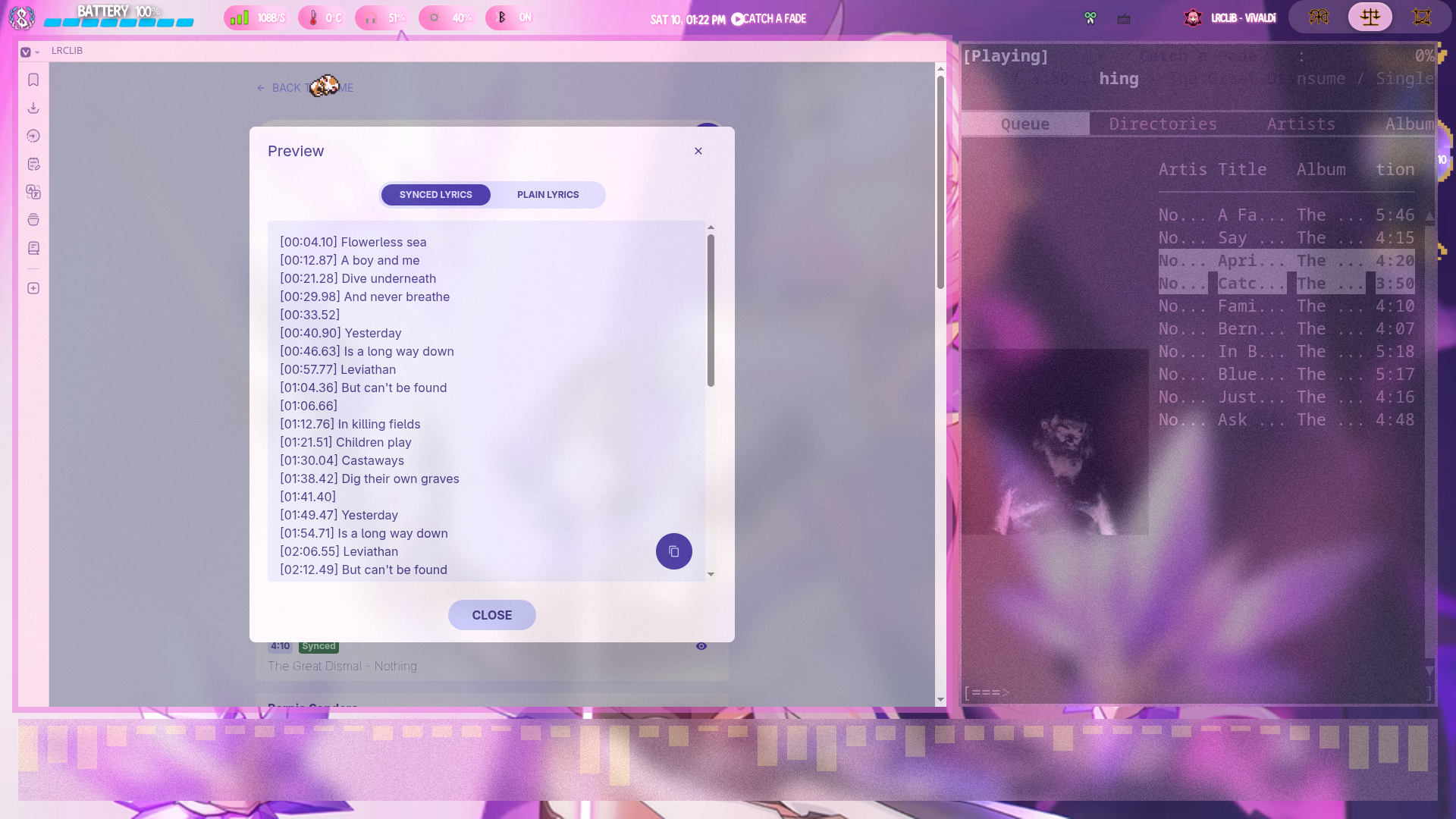 if LRCLIB doesn't have synced lyrics for your song you can convert song lyrics to timed lyrics. Copy the non timed lyrics into your text editor as before. For each line add the time they appear in the song at the beginning of the line in square brackets [mm:ss.msms]. After the last line add an extra line that is the songs length in square brackets and save as shown above.